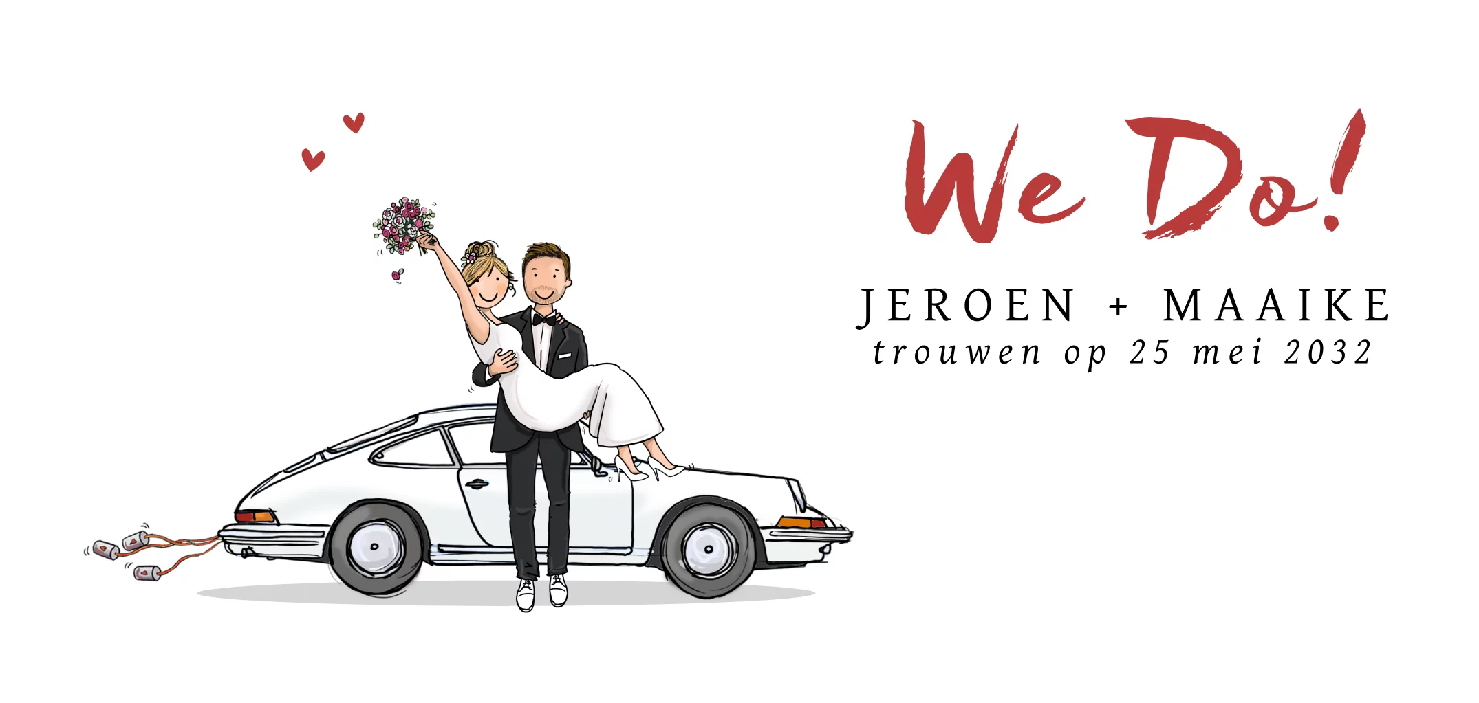 Trouwkaart auto Porsche 911 wit met bruidspaar, teksten zijn naar wens aanpasbaar. De auto kun je vervangen door een fiat, volkswagen, citroen etc. In de clipart staan veel leuke auto's klaar. De binnenkant heeft links een mooie tijdlijn die je naar wens kunt aanpassen. Veel plezier ermee.