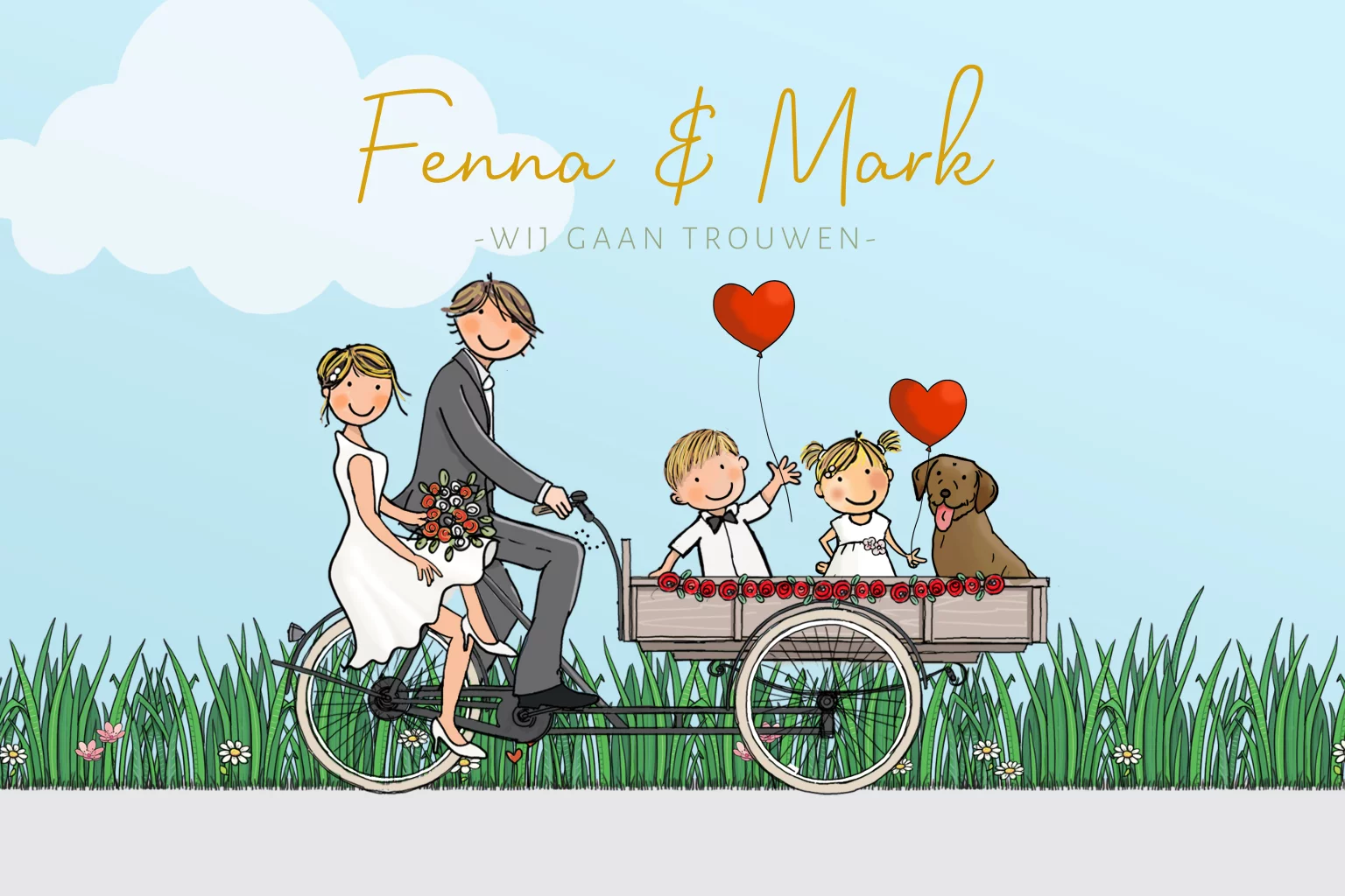 Wat is er leuker dan een trouwkaart met een bakfiets en vrolijke achtergrond? Deze kaart is perfect voor een gezin met kinderen. De tekst is getekend en de kleuren zijn prachtig.