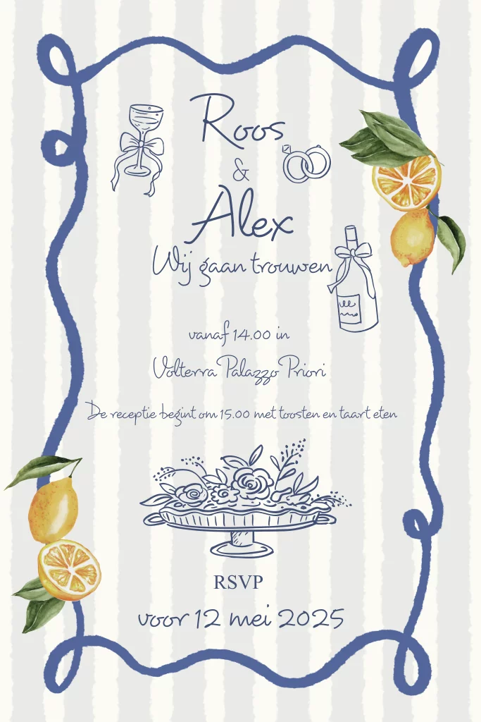 Trouwkaart blauwe rand met citroenen en doodles