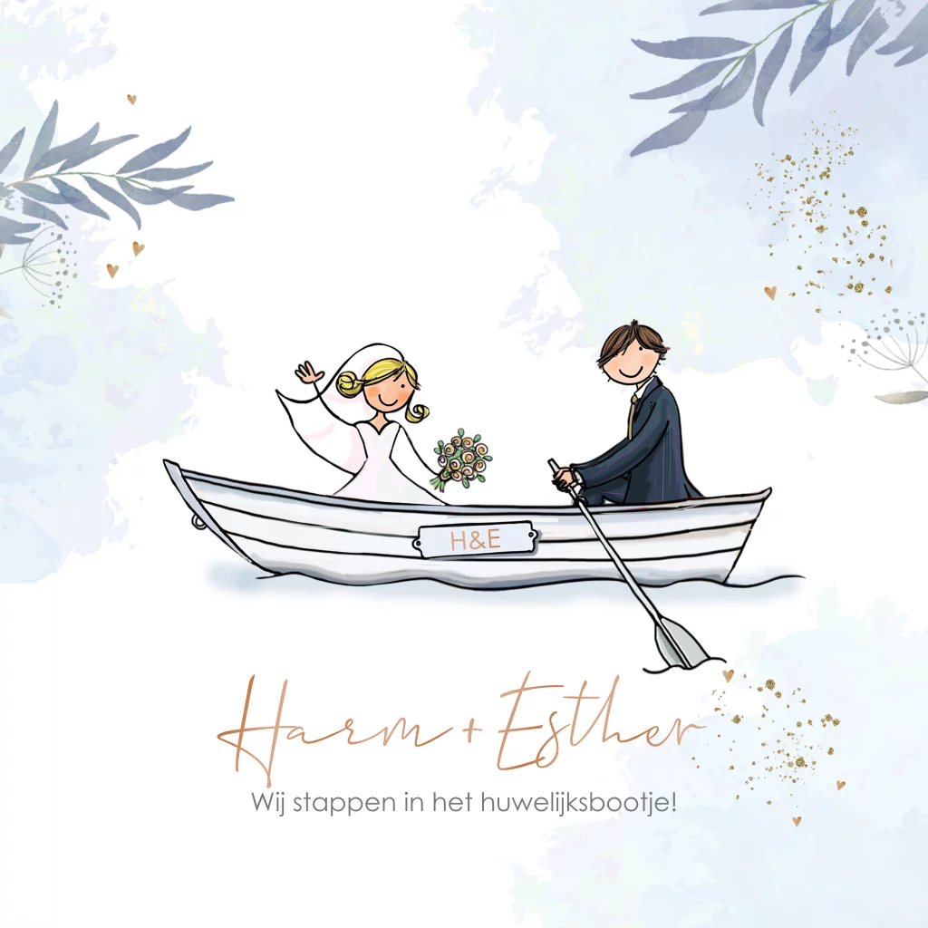 Trouwkaart bootje met bruidspaar en takjes en watercolor, deze kaart is naar wens zelf samen te stellen met teksten en kleine illustraties uit de clipart. Veel plezier ermee.