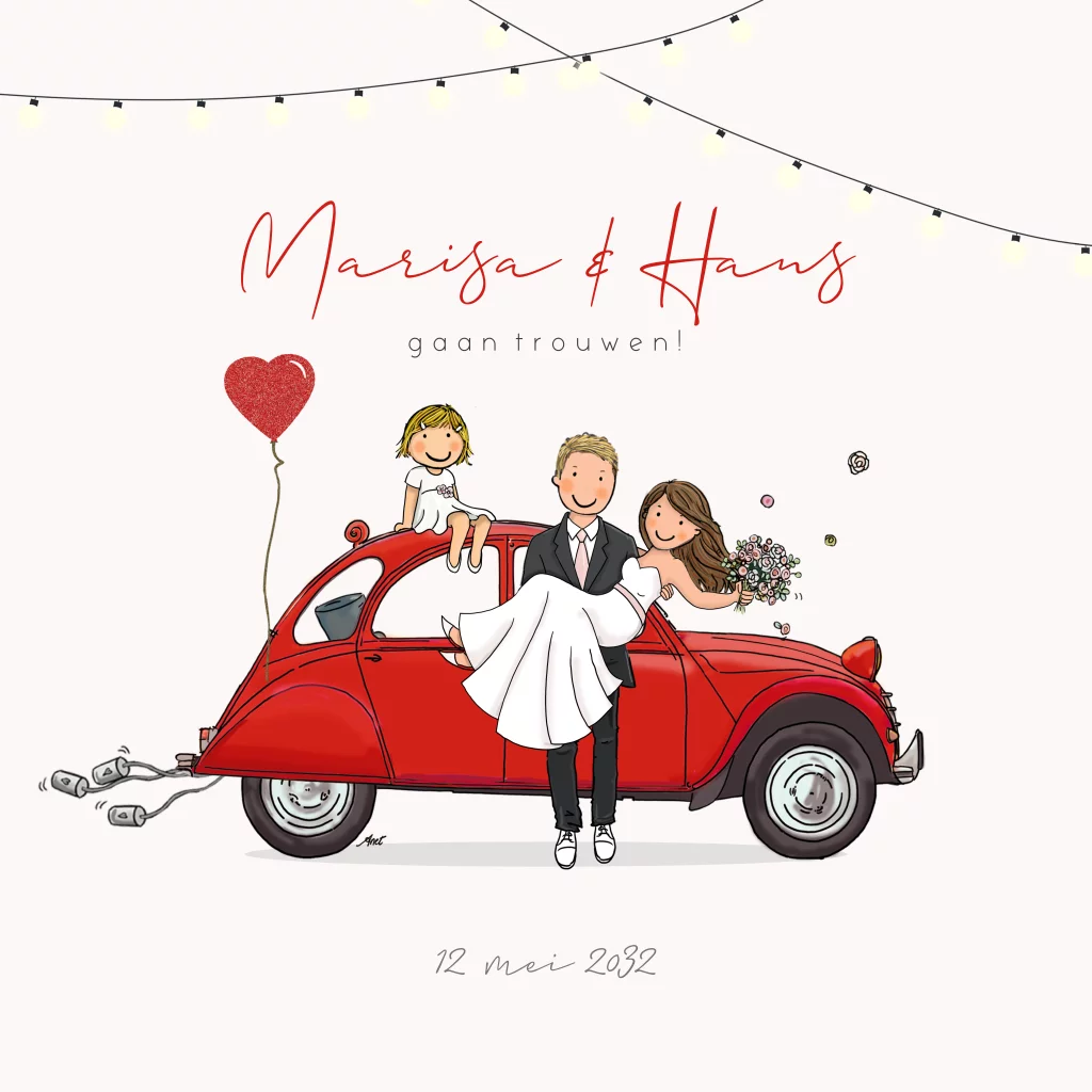 Trouwkaart bruidspaar auto citroen 2cv rood met bruidspaar. Alle illustraties zijn vervangbaar uit de clipart. Zo kun je helemaal naar wens je trouwkaart samenstellen.