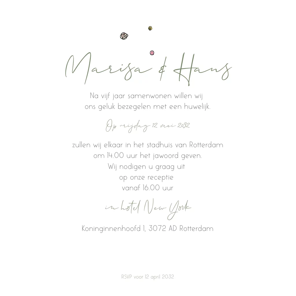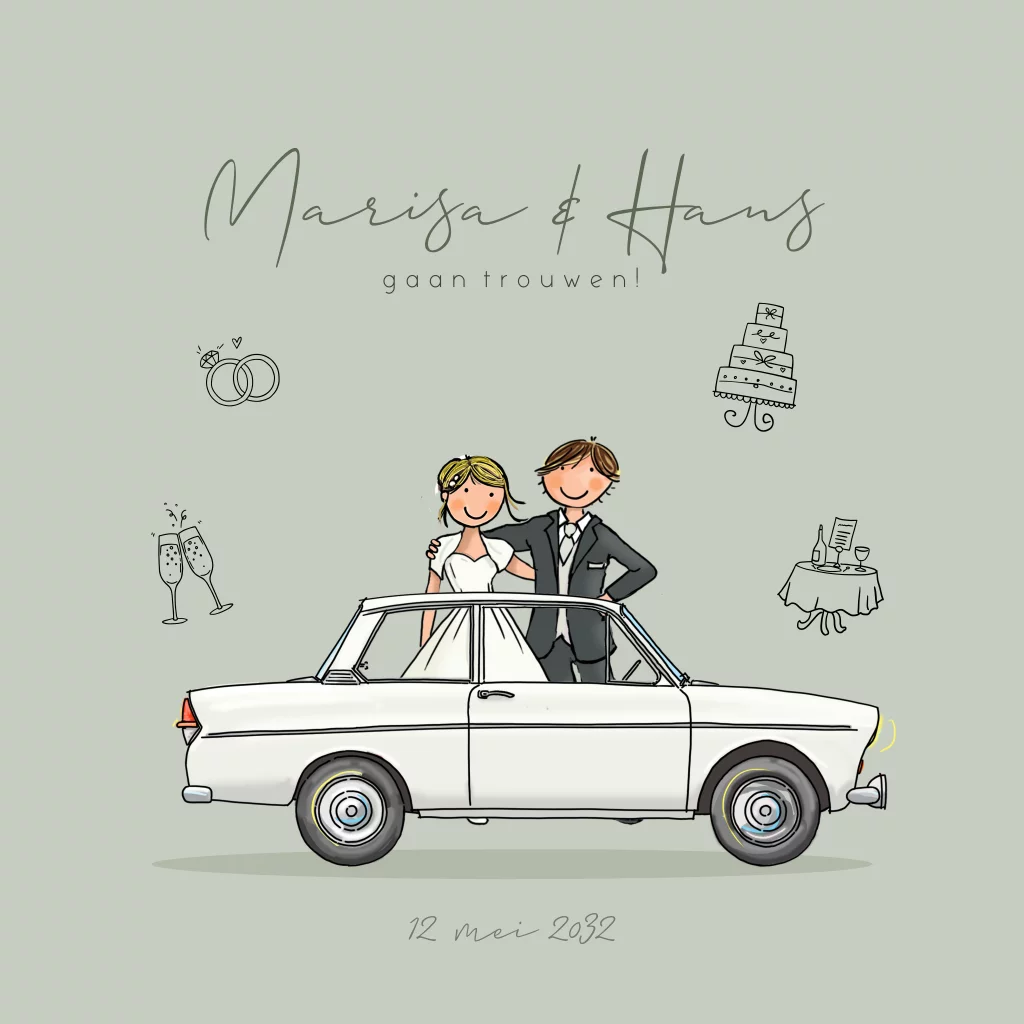 Trouwkaart bruidspaar auto daf wit, watercolor achtergrond en dwarrelende bloemen. Alle illustraties zijn vervangbaar uit de clipart. Zo kun je helemaal naar wens je trouwkaart samenstellen.