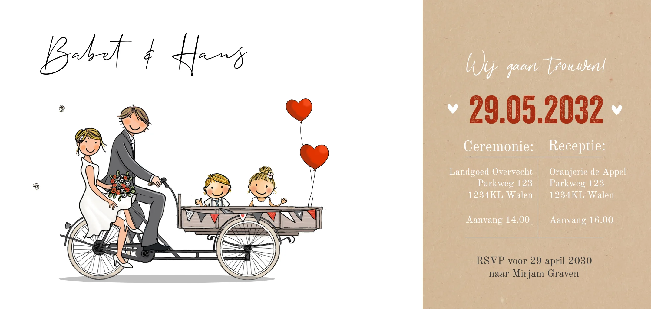 Trouwkaart bakfiets met bruidspaar en kinderen, rode ballonnen en vlaggetjes maken het helemaal af. De afbeeldingen zijn los dus je kunt naar wens uit de clipart de kinderen aanpassen.