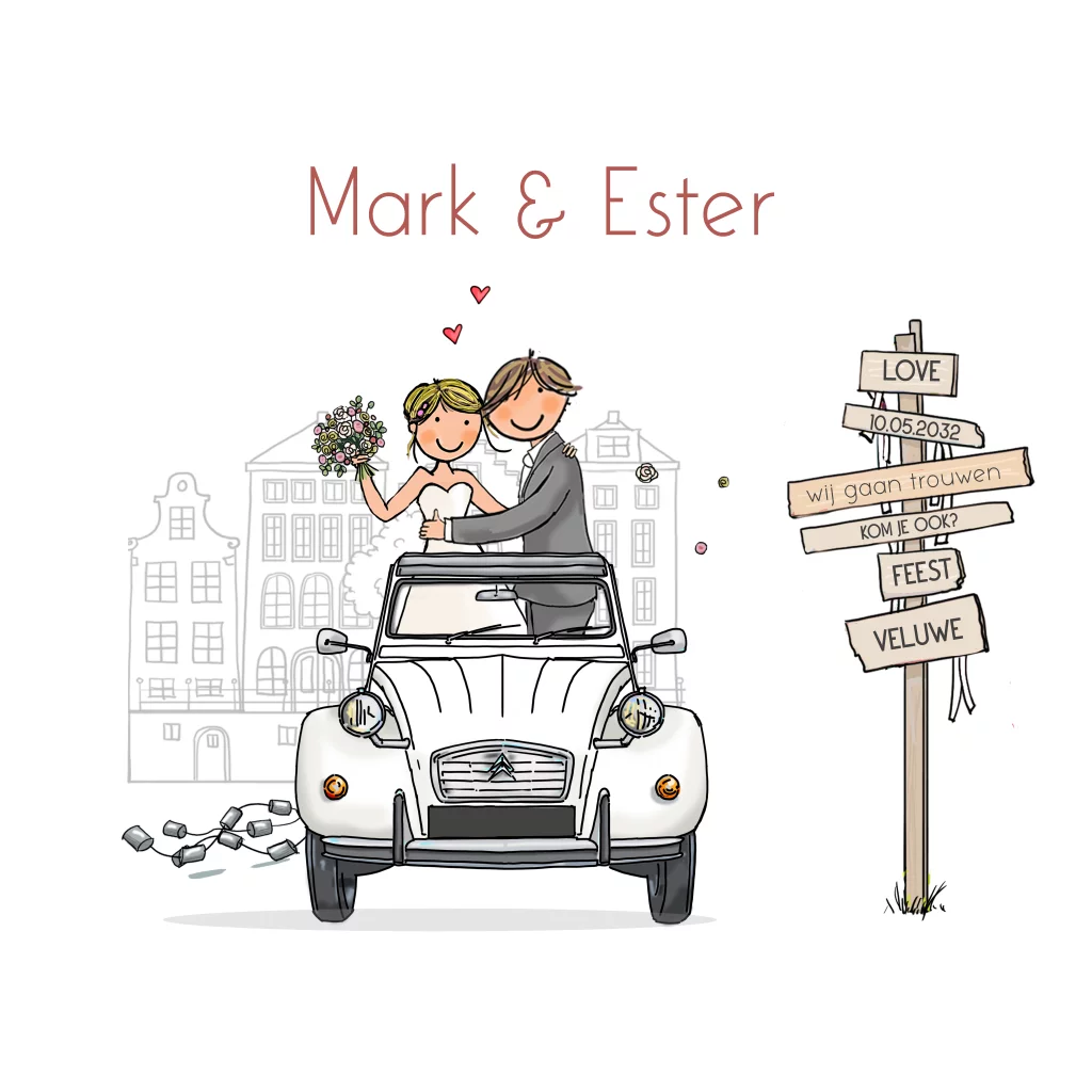 Trouwkaart bruidspaar Citroen cv wit, bordjes op paal en dwarrelende bloemen. Alle illustraties zijn vervangbaar uit de clipart. Zo kun je helemaal naar wens je trouwkaart samenstellen.
