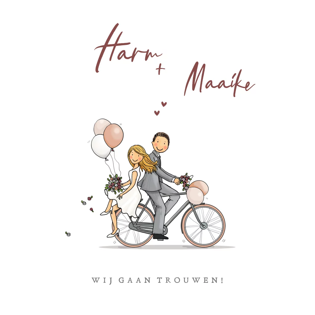Trouwkaart bruidspaar gemengd op de fiets met ballonnen, bloemen en hartjes. Teksten zijn naar wens aanpasbaar.