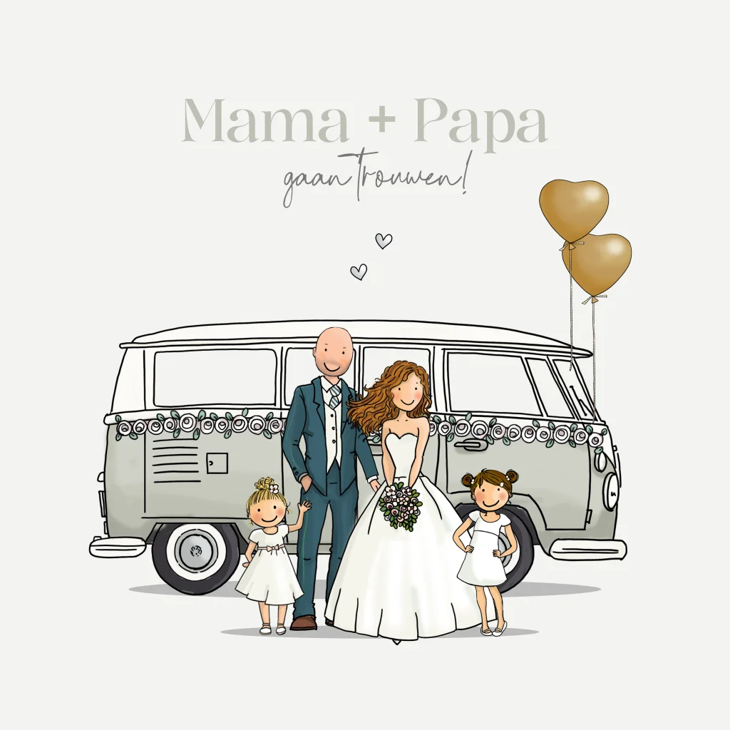 Trouwkaart bruidspaar grijsgroen papa en mama vwbus
