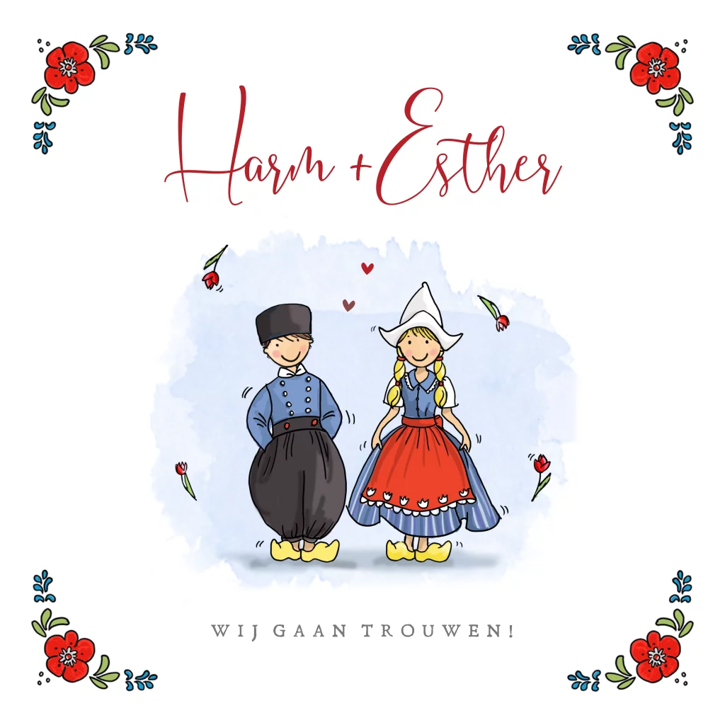 Trouwkaart bruidspaar klederdracht hollands, deze kaart is naar wens zelf samen te stellen met illustraties uit de clipart. Veel plezier ermee.