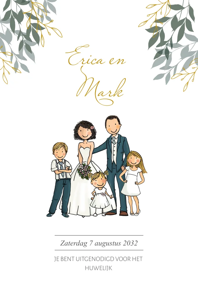 Trouwkaart bruidspaar met gezin en takjes, dit kaartje is geheel naar wens aanpasbaar, je kunt uit de clipart diverse getekende kinderen en bruid of bruidegoms uitkiezen.