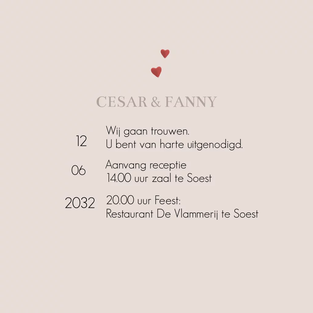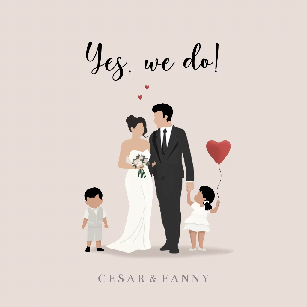 Trouwkaart bruidspaar met kinderen en hartjes. Deze kaart is geheel naar wens zelf samen te stellen en perfect voor een bruidspaar met kinderen. De bruid en bruidegom met kinderen zijn uit de clipart te vinden en maken de kaart extra bijzonder.