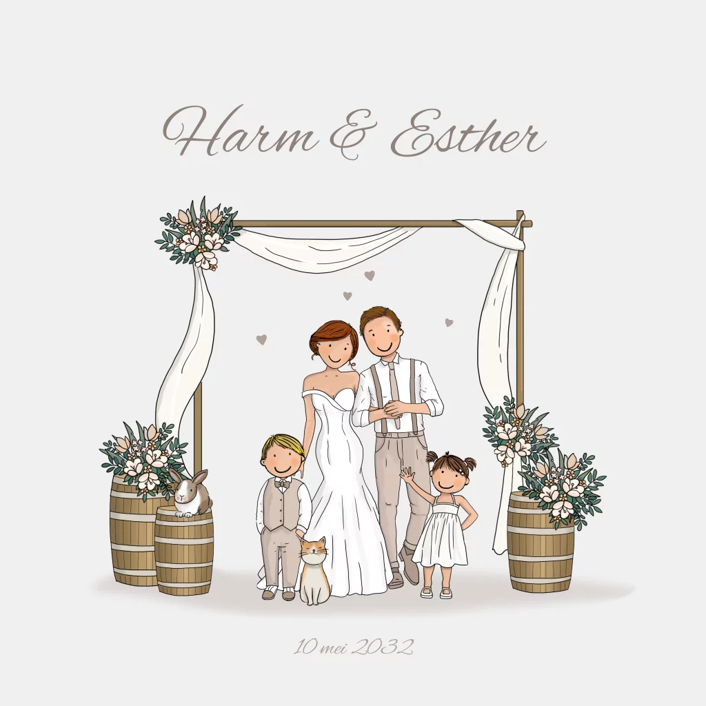 Trouwkaart bruidspaar onder boog met tonnen. Deze kaart is geheel naar wens zelf samen te stellen en perfect voor een bruidspaar met kinderen. De bruid en bruidegom met kinderen zijn uit de clipart te vinden en maken de kaart extra bijzonder.