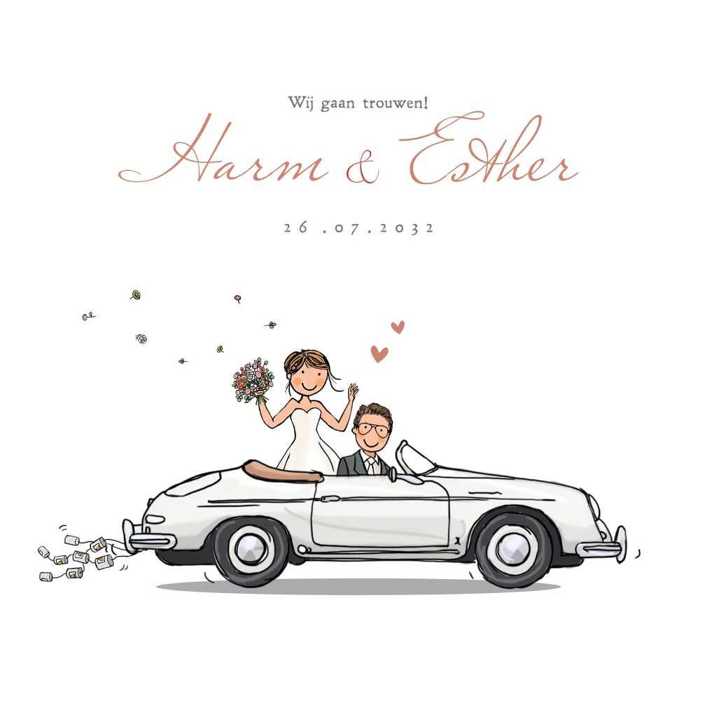 Trouwkaart sportwagen cabrio wit met hartjes, deze kaart is naar wens zelf samen te stellen met illustraties uit de clipart. Veel plezier ermee.