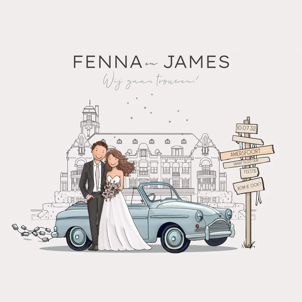 Trouwkaart bruidspaar retro cabrio met bruidspaar. De teksten zijn naar wens samen te stellen. Ook de stad is aan te passen naar een andere stad.