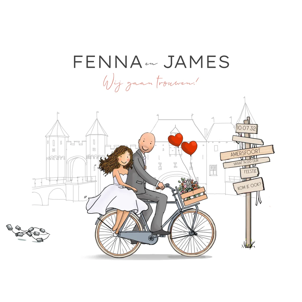 Trouwkaart bruidspaar fiets met ballonnen met Amersfoort op de achtergrond. De teksten zijn naar wens samen te stellen. Ook de stad is aan te passen naar een andere stad.