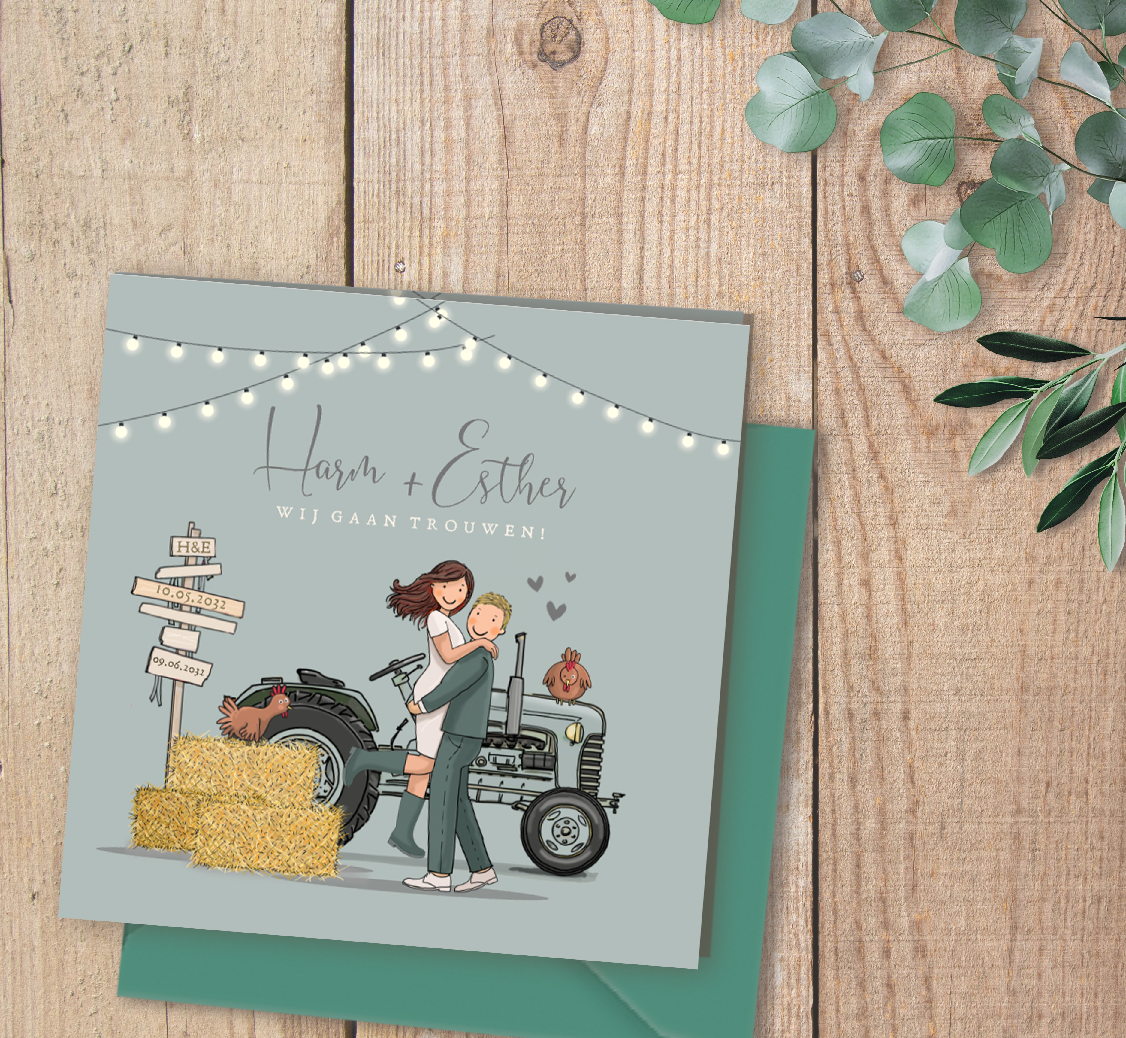 Trouwkaart bruidspaar tractor blauwgroen met hooibalen en lichtjes, deze kaart is naar wens zelf samen te stellen met illustraties uit de clipart. De trouwkaart heeft zijn eigen huisstijl met een bijpassende menukaart, bedankkaart, save the date en een sluitzegel.