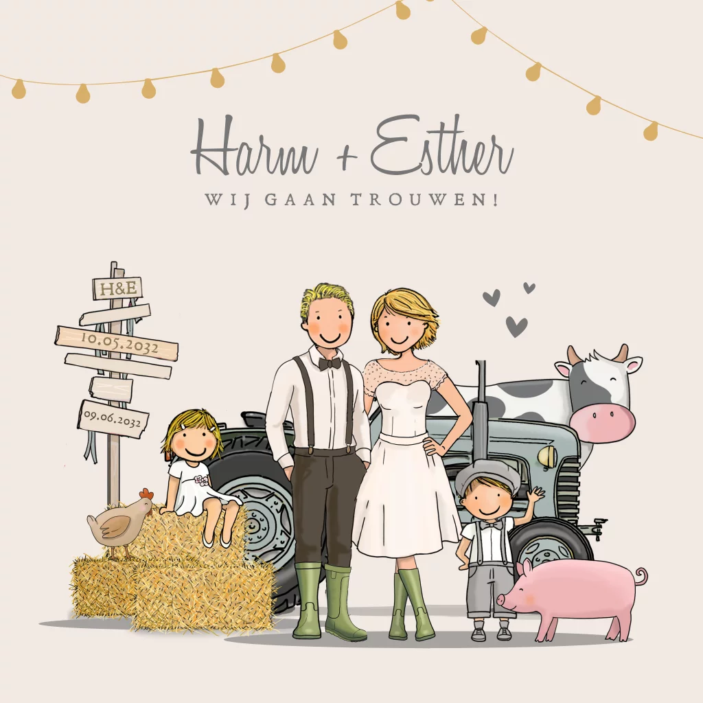 Trouwkaart bruidspaar tractor groengrijs met hooibalen en lichtjes