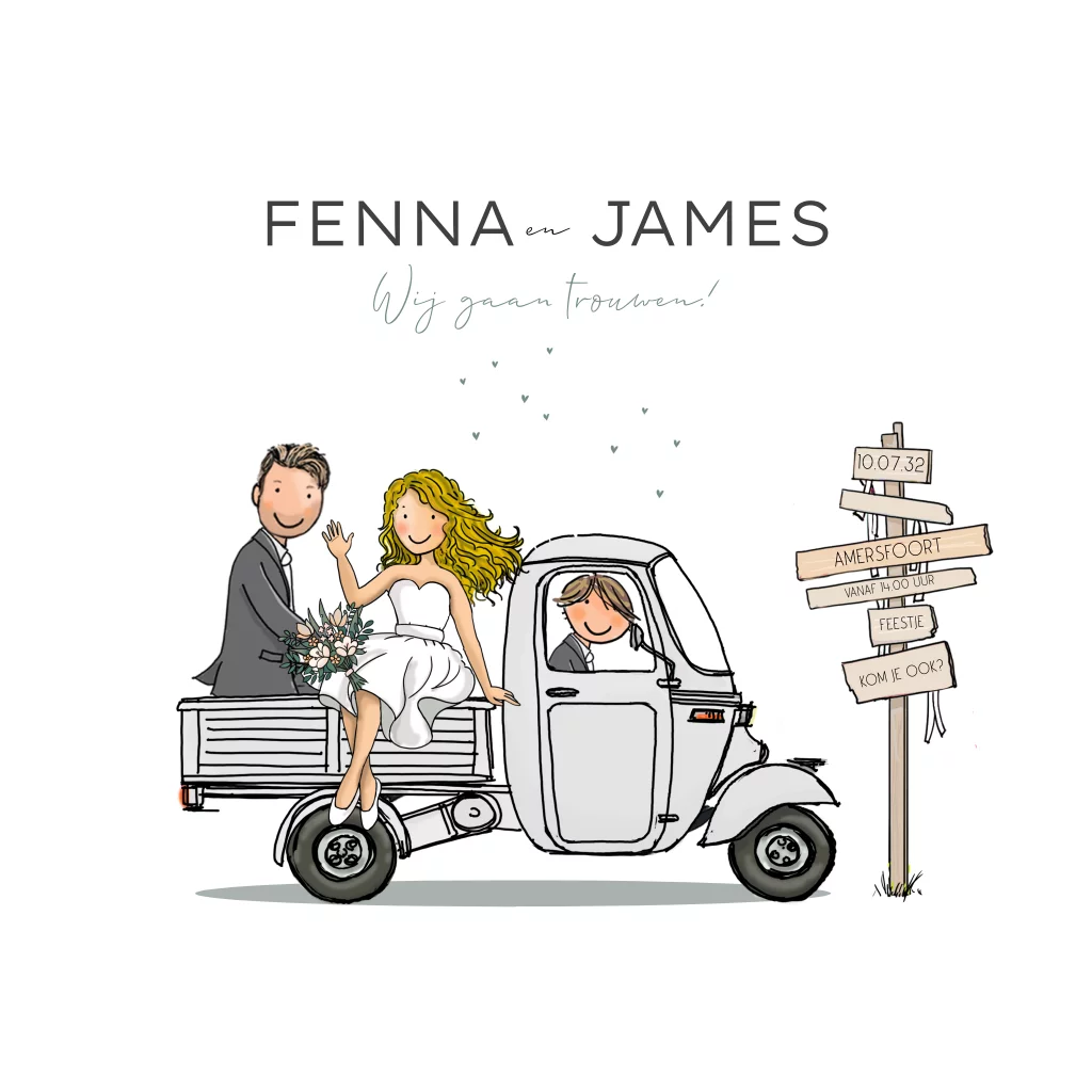 Zoek je een unieke trouwkaart met een grappige touch? Kies dan voor deze trouwkaart met een vespa ape wit met chauffeur! Deze stoere trouwkaart is perfect voor een bruidspaar dat houdt van auto's en voertuigen.