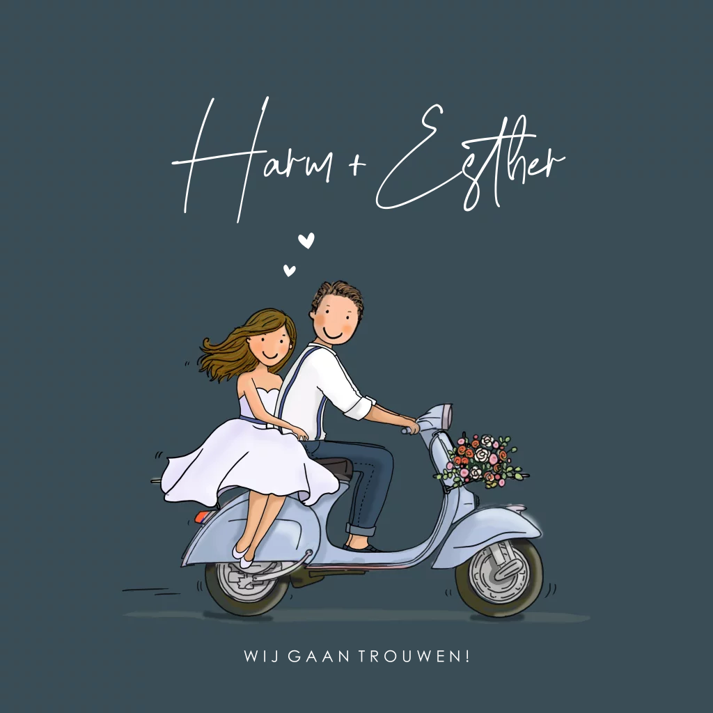 Trouwkaart bruidspaar Vespa scooter blauwgrijs