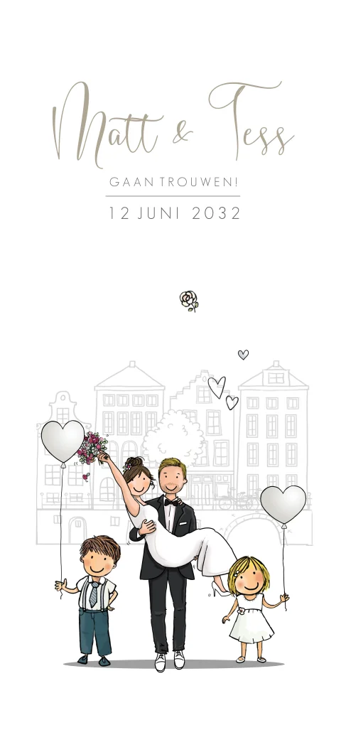 Trouwkaart bruidspaar met kinderen beige met hartjes ballonen en tijdlijn. Je kunt deze kaart helemaal naar wens samenstellen. Er staan veel leuke afbeeldingen in de clipart.