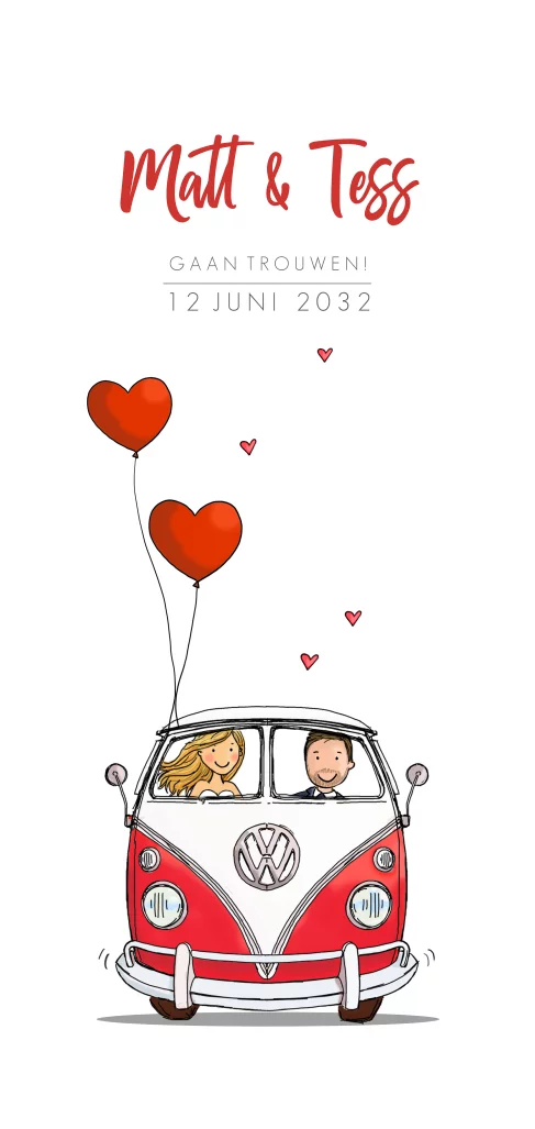 Trouwkaart bruidspaar volkswagen busje T1 rood met hartjes ballonen en tijdlijn. Je kunt deze kaart helemaal naar wens samenstellen. Er staan veel leuke afbeeldingen in de clipart.