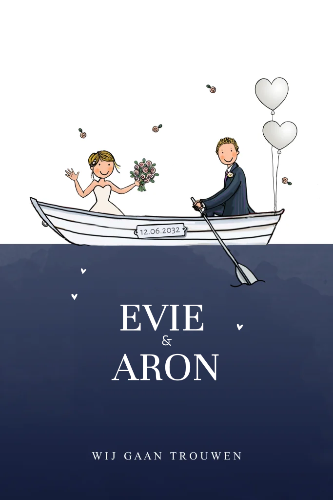 Trouwkaart bruidspaar met wit bootje en blauwe achtergrond: een unieke, aanpasbare kaart voor een onvergetelijke dag! Of je nu op zoek bent naar een unieke trouwkaart, of gewoon een leuk kaartje om je gasten mee te verrassen, deze trouwkaart bruidspaar zwart met wit bootje en blauwe achtergrond is een echte eye-catcher! Je kunt de kaart helemaal naar wens aanpassen door uit de clipart diverse getekende kinderen en het bruidspaar te kiezen. Deze luxe trouwkaart is verkrijgbaar in verschillende formaten, met of zonder koperfolie, en is een echt sieraad voor je speciale dag!