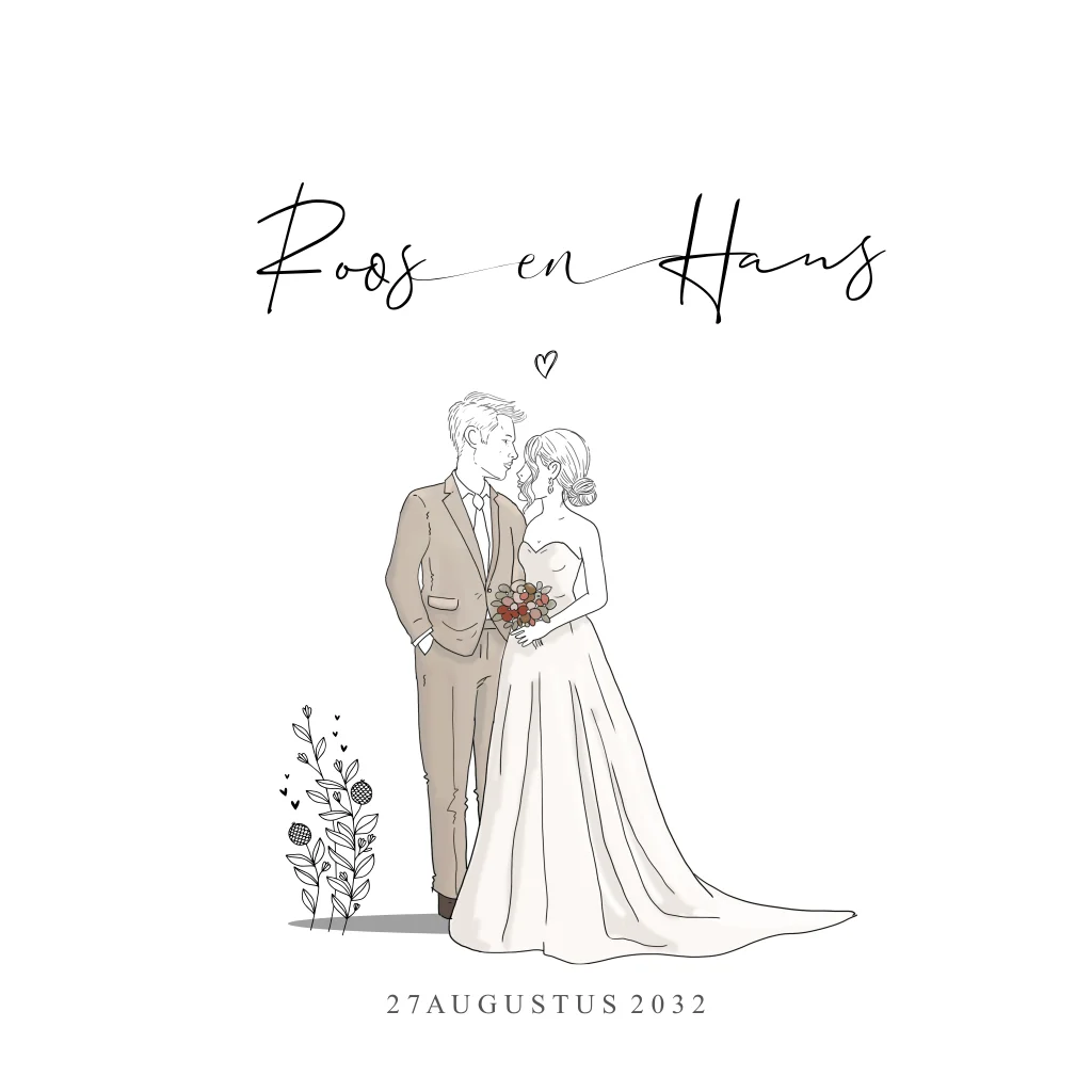 Trouwkaart bruispaar getekend met takjes. Wil je graag hulp, mail of bel ons dan.