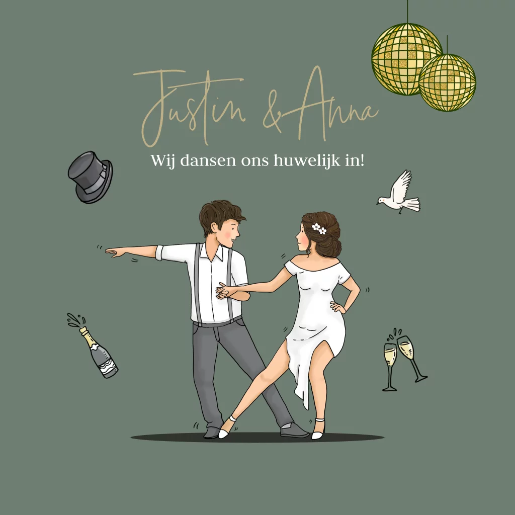 Op zoek naar de perfecte trouwkaart om jullie speciale dag aan te kondigen? Ontdek onze prachtige trouwkaart met een dansend trouwstel en een champagne fles. De kaart straalt elegantie en vreugde uit, perfect passend bij jullie viering.