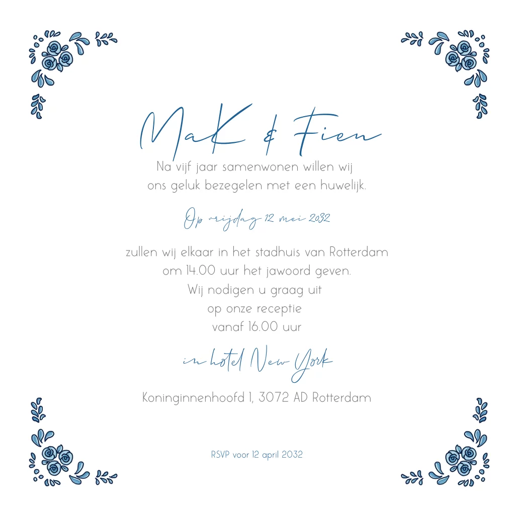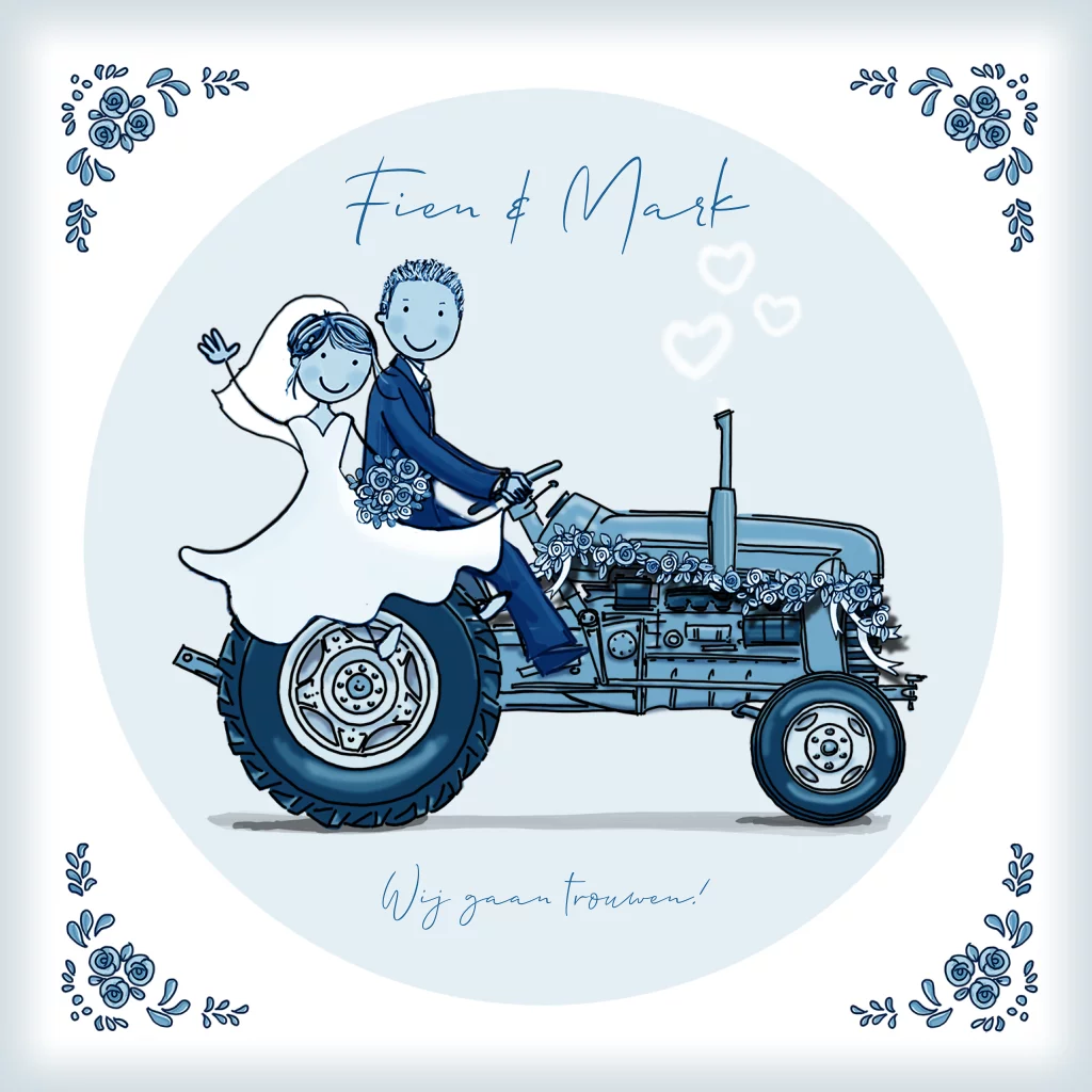 Trouwkaart delftsblauw tractor met bruidspaar. Een prachtige kaart en heel origineel. De teksten zijn naar wens samen te stellen.