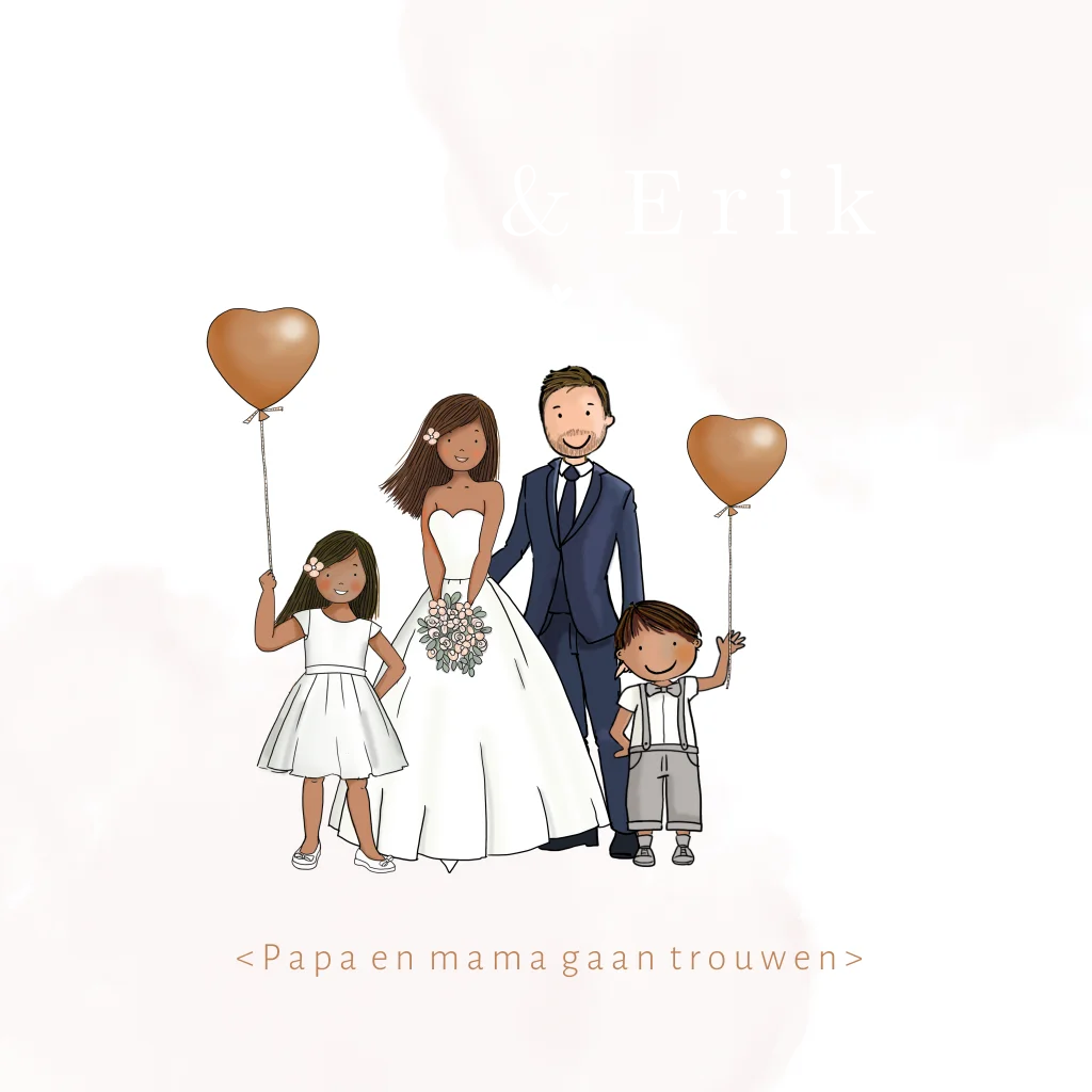 Trouwkaart familie met kinderen en ballonnen, deze kaart is naar wens zelf samen te stellen, de kinderen, bruid en bruidegom zijn uit te kiezen uit onze clipart