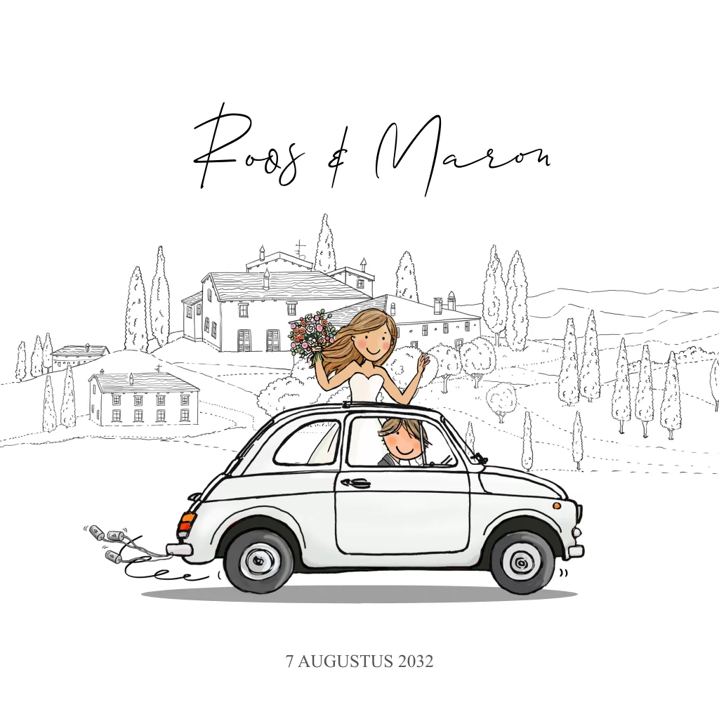 Leuke originele trouwkaart met daarop bruidspaar in fiat 500 met op de achtergrond Toscane Italie. Alles is aanpasbaar. Wil je graag hulp, mail of bel ons dan.