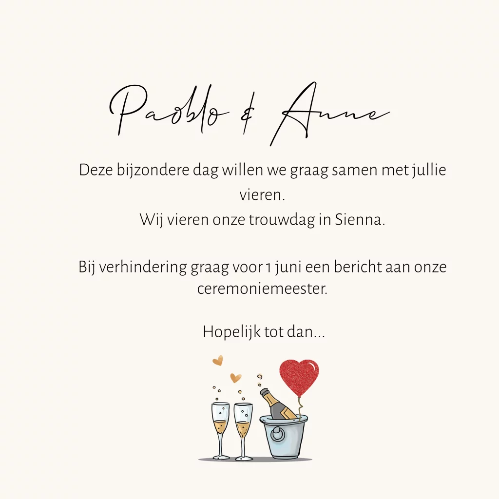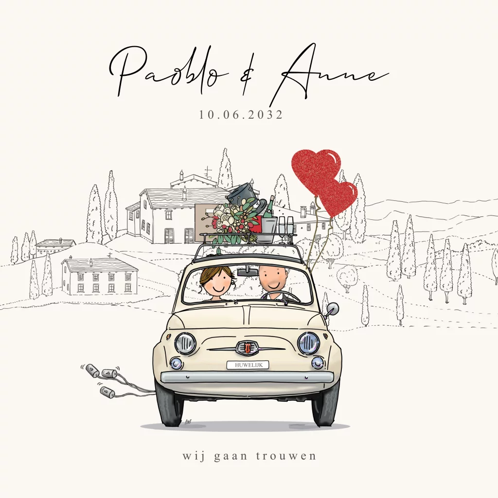 Leuke originele trouwkaart met daarop bruidspaar in fiat 500 voorkant met op de achtergrond Toscane Italie. Alles is aanpasbaar. Wil je graag hulp, mail of bel ons dan.
