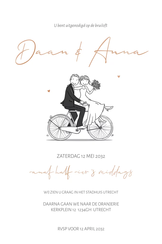 Trouwkaart fiets met bruidspaar zwart wit koperfolie