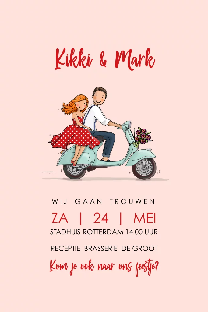 Trouwkaart getekend bruidspaar op retro vespa, prachtig en origineel. Wat een feestje! Deze unieke en kleurrijke trouwkaart is getekend door een bruidspaar dat op een retro vespa rijdt. Het is een grappige en vrolijke kaart die perfect past bij een bruiloft in deze bijzondere tijd.