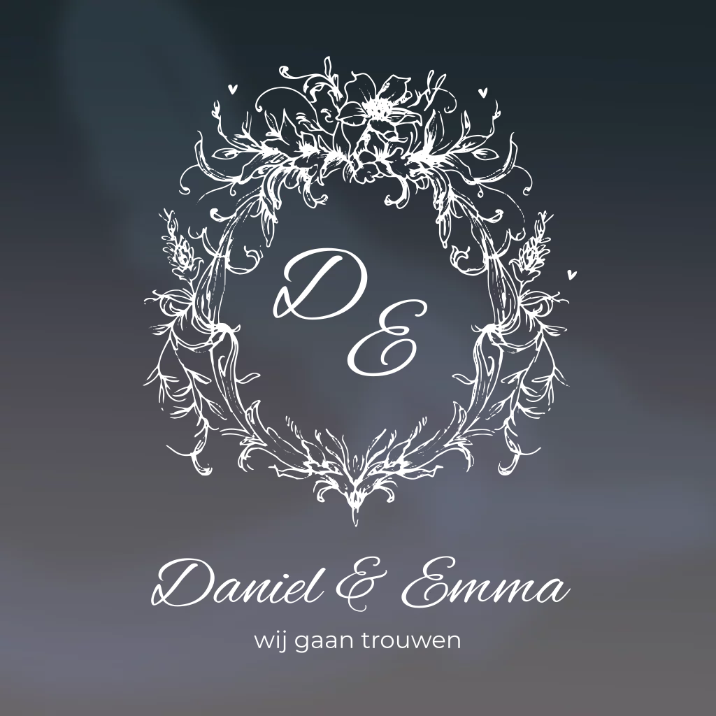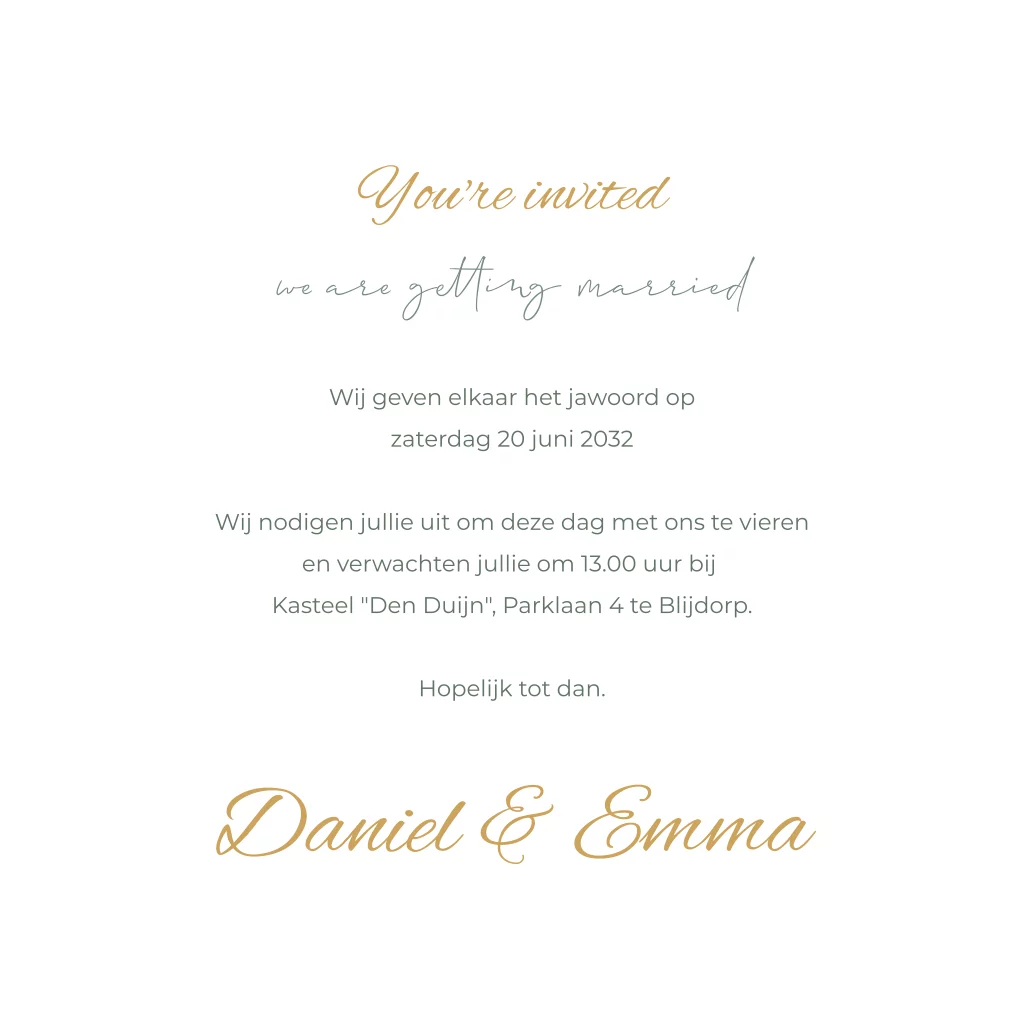 Trouwkaart goudfolie frame bloemen met letters. Prachtige tijdloze kaart met aanpasbare teksten.