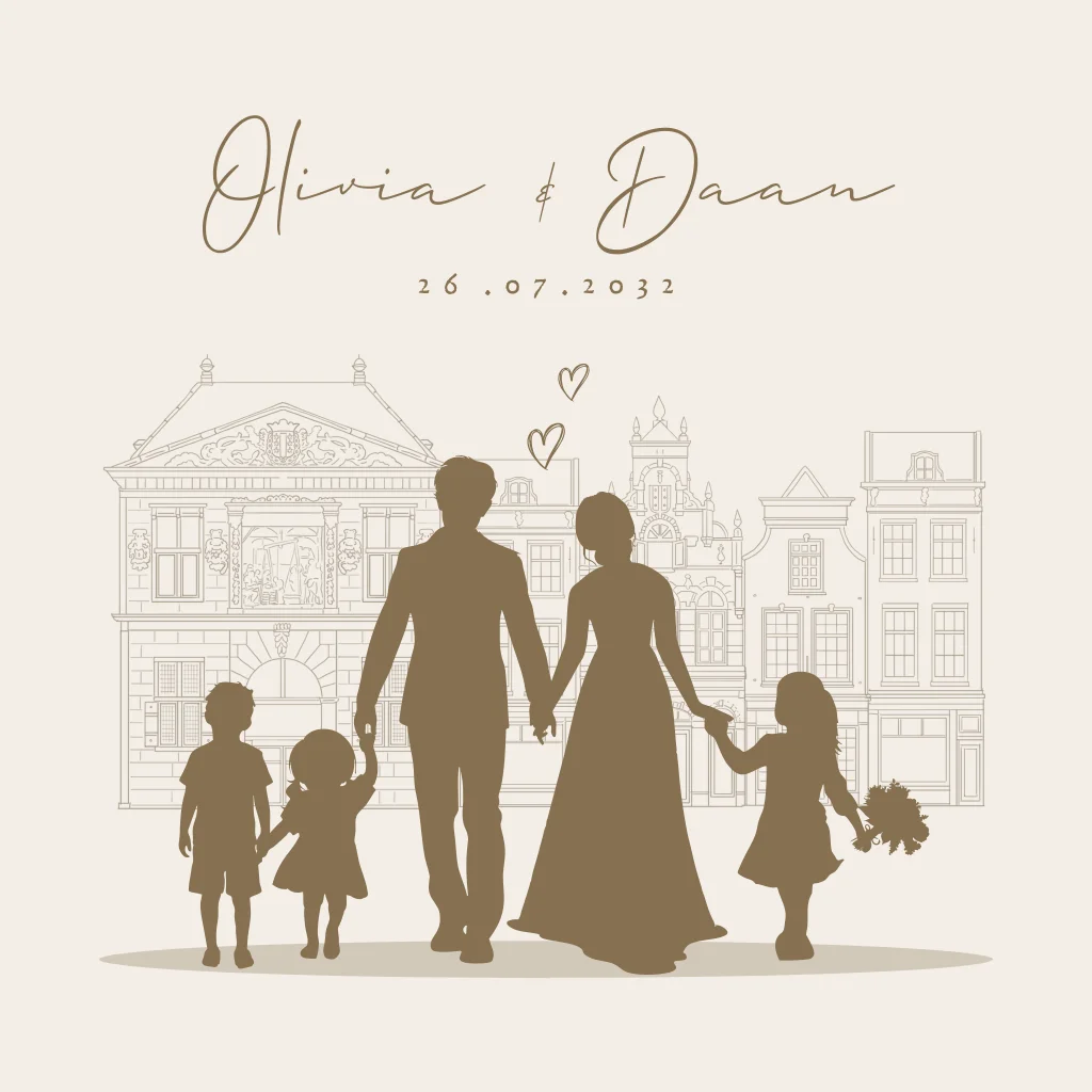 Trouwkaart hand in hand met kinderen en boeket, deze kaart is naar wens zelf samen te stellen met illustraties uit de clipart. Veel plezier ermee.