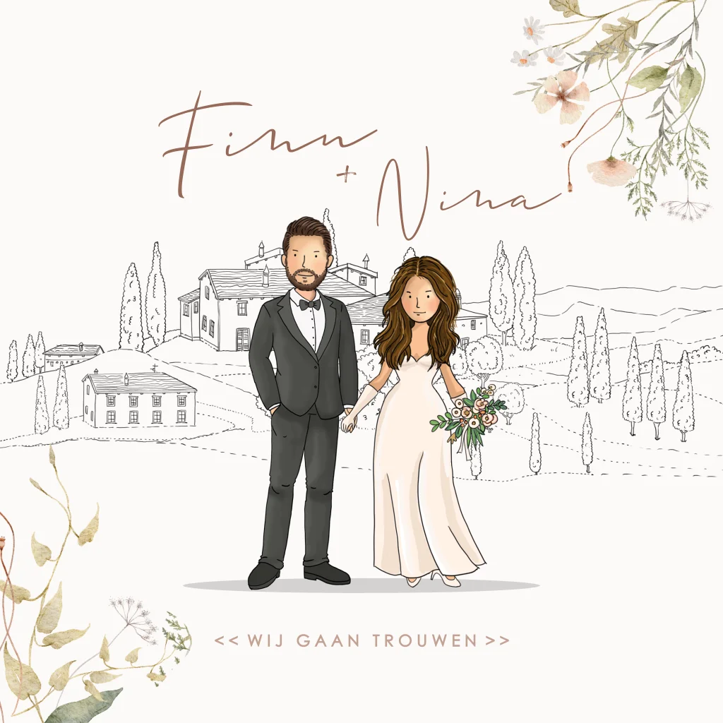 Trouwkaart prachtig bruidspaar met veldbloemen, dan is deze tekening van een bruidspaar is perfect voor jullie! Met deze unieke trouwkaart zullen je vrienden en familie zeker versteld staan! De poppetjes zijn uit de clipart te kiezen mocht je blond of ander kleur haar hebben.