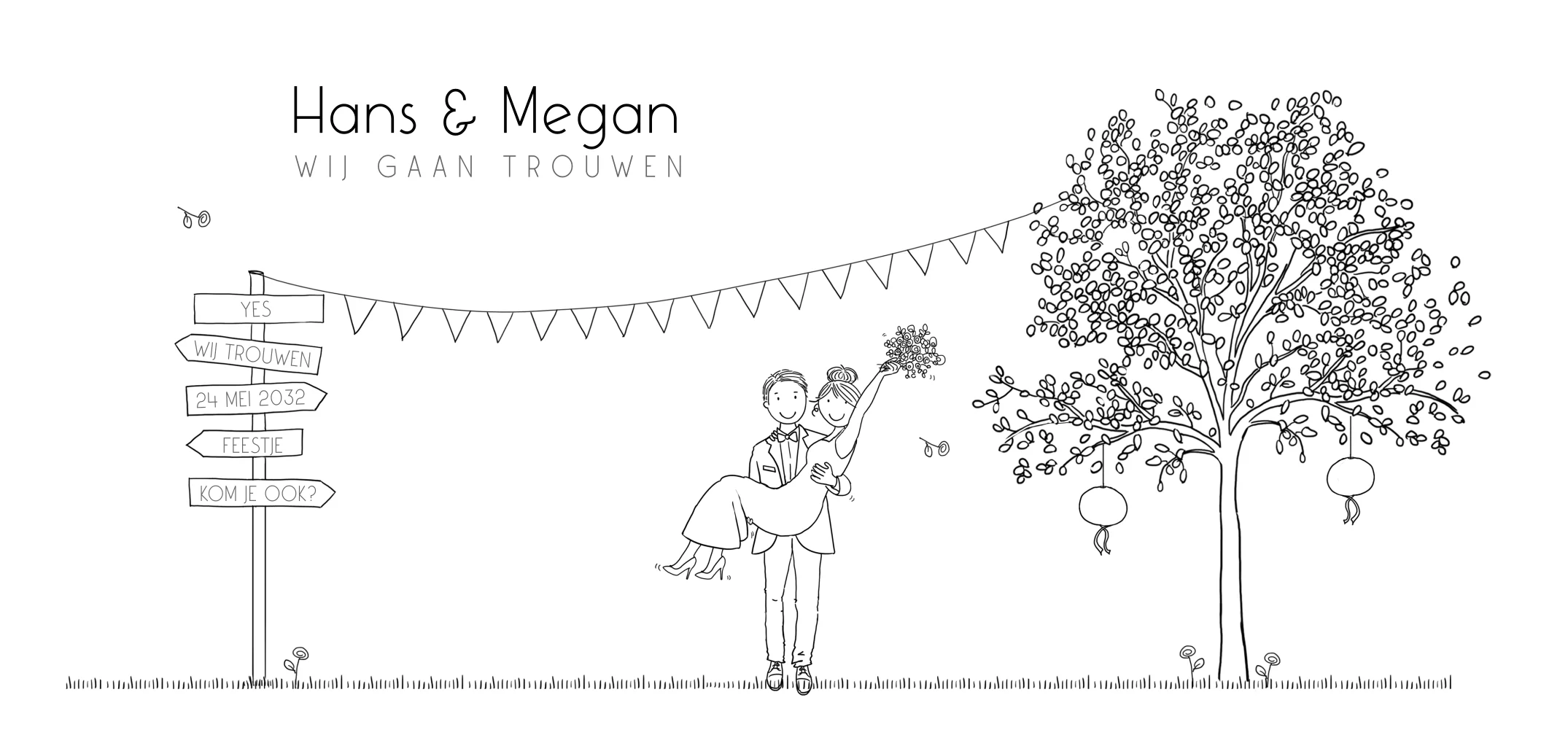 Trouwkaart illustratie bruidspaar met boom en bordjes, in de clipart staan verschillende tekeningen, zo kan je naar wens je kaart samenstellen.