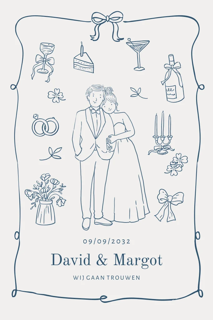 Mooie getekende trouwkaart met bruidspaar en losse passende doodle illustraties. Wat een originele lieve kaart.