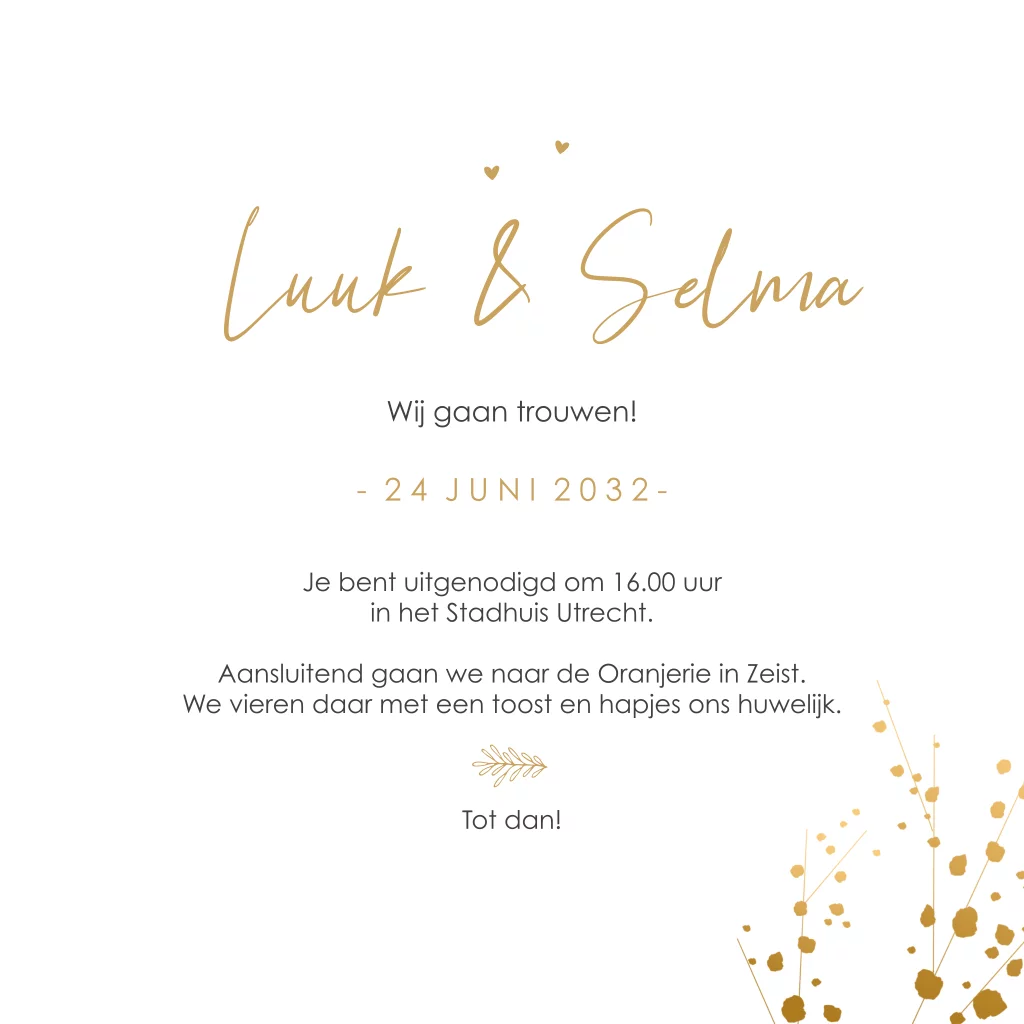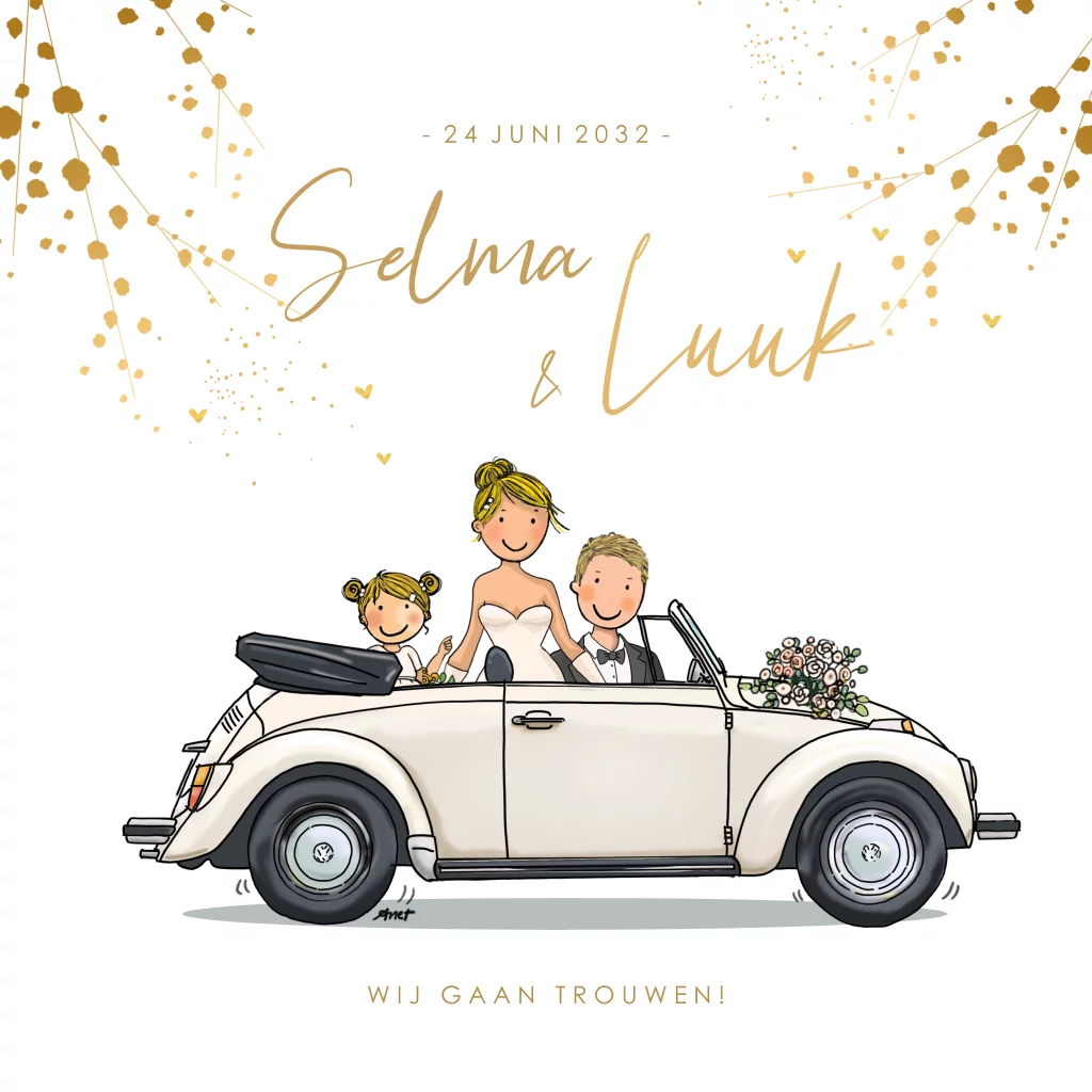 Wanneer je op zoek bent naar een unieke en bijzondere trouwkaart, dan is deze trouwkaart kever met bruidspaar en kinderen en goudlook echt iets voor jou! Deze kaart is gemaakt van handtekende illustraties waardoor het een prachtige en luxe uitstraling heeft. De auto op de kaart is ook een leuk detail, waardoor deze kaart perfect is voor een bruiloft.
