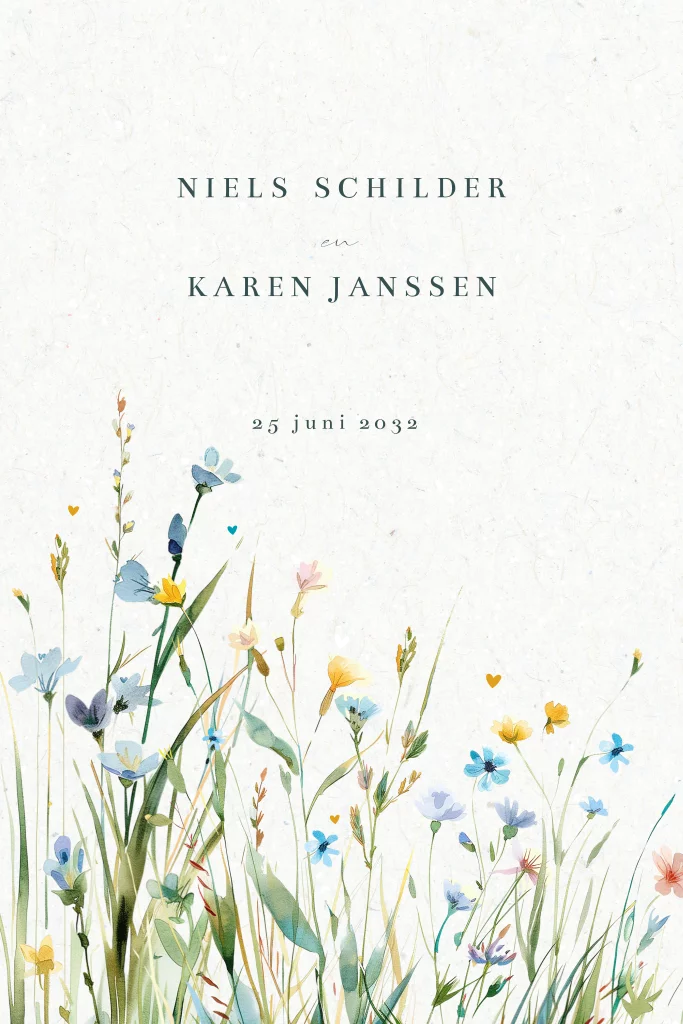 Op zoek naar de perfecte trouwkaart die de romantische en kleurrijke sfeer van jullie grote dag weerspiegelt? Ontdek onze prachtige trouwkaart met kleurrijke veldbloemen en hartjes! Deze unieke uitnodiging ademt een botanische en florale sfeer, perfect voor een lentebruiloft of een viering in de natuur.