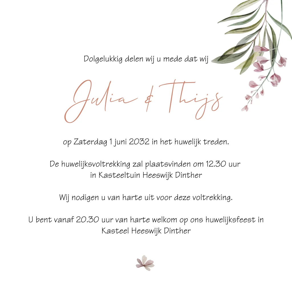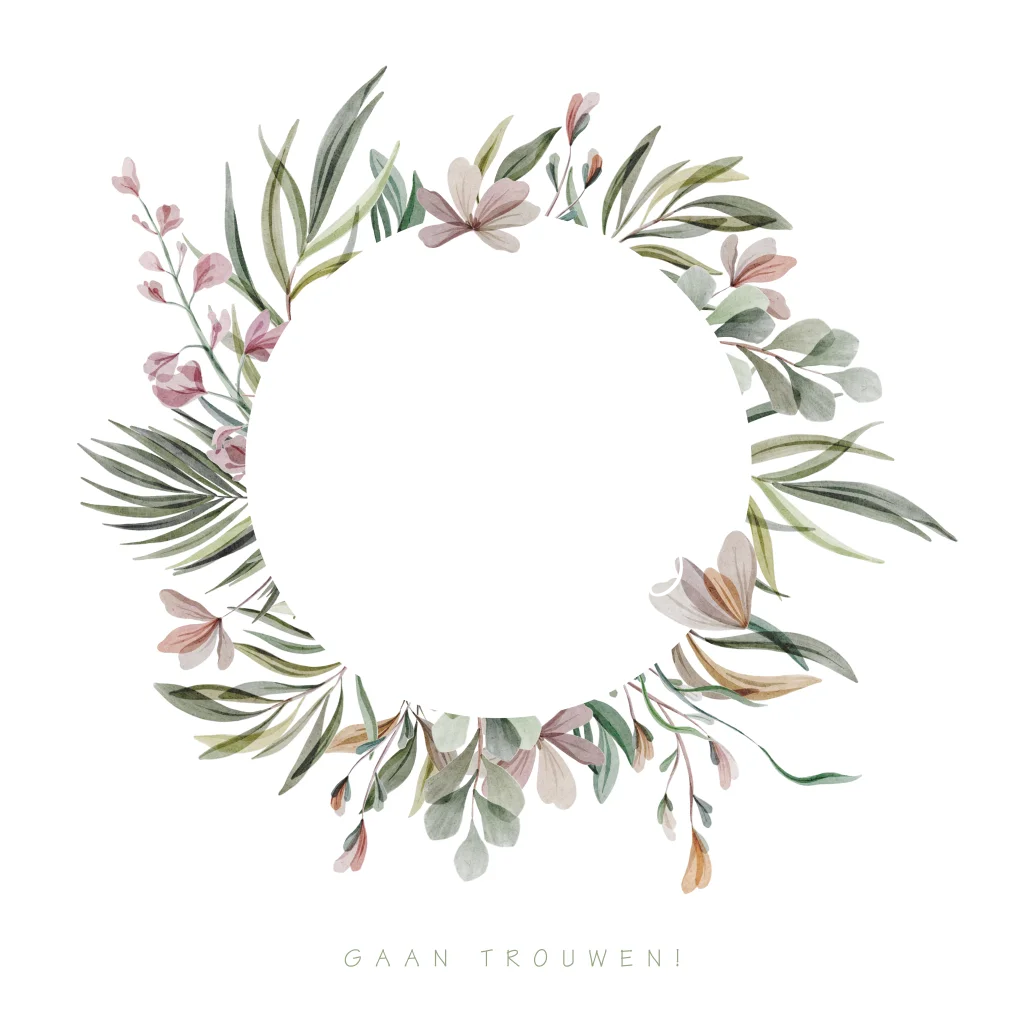 Trouwkaart krans met veldbloemen en koperfolie hartjes