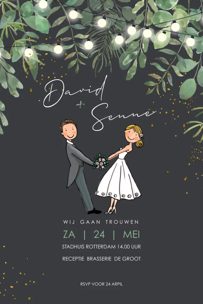 Trouwkaart lampjes met bruidspaar en takjes groen, het bruidspaar staat ook in de clipart waardoor je naar wens je kaart kan samenstellen.