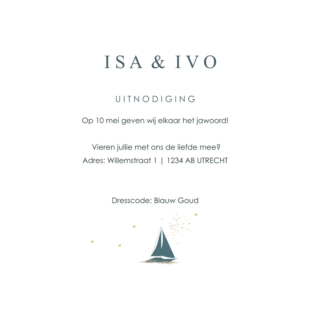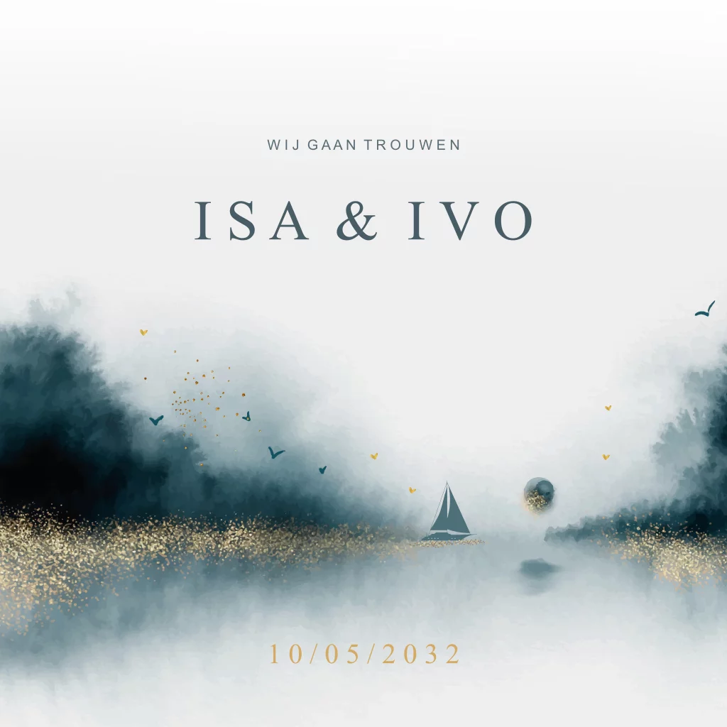 Trouwkaart landschap blauw goudlook met bootje en geheel aanpasbare teksten