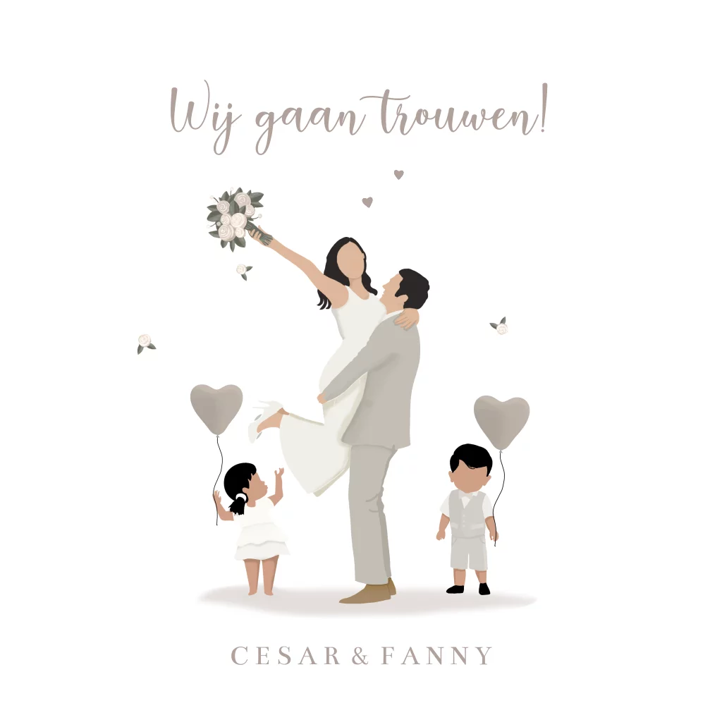 Trouwkaart optillend bruid met kinderen en hartjes. Deze kaart is geheel naar wens zelf samen te stellen en perfect voor een bruidspaar met kinderen. De bruid en bruidegom met kinderen zijn uit de clipart te vinden en maken de kaart extra bijzonder.
