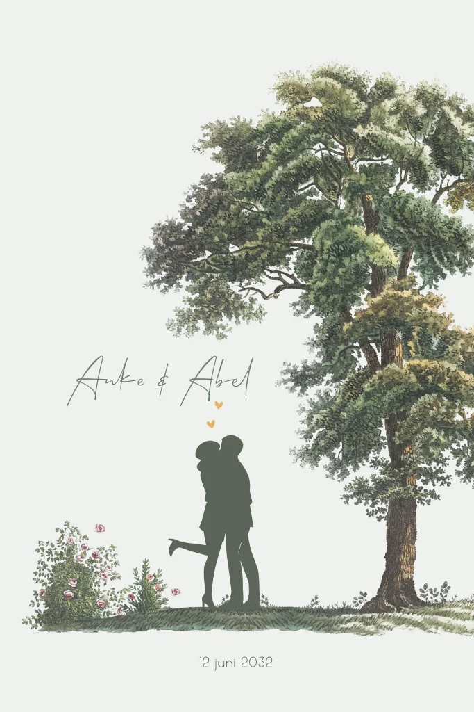 Prachtige oude boom met lampjes en romantisch stel met bloemen, de teksten zijn naar wens aanpasbaar.
