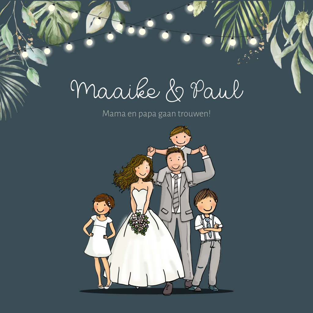 Trouwkaart bruidspaar met papa met zoontje op zijn nek en twee andere leuke kinderen. Mama in mooie jurk