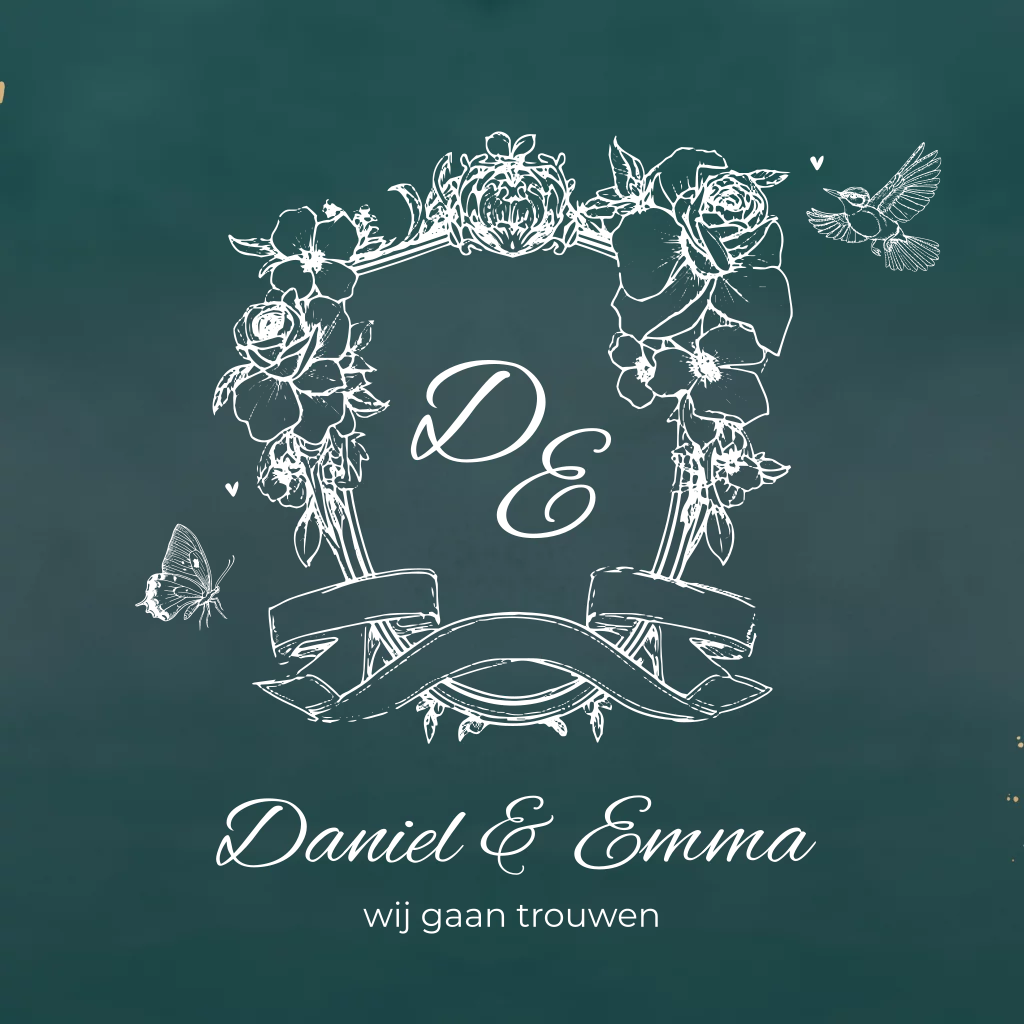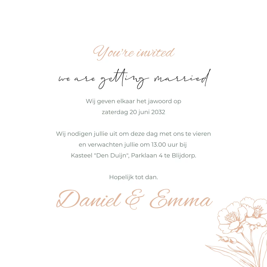Trouwkaart roze folie kaderframe bloemen met letters. Prachtige tijdloze kaart met aanpasbare teksten.
