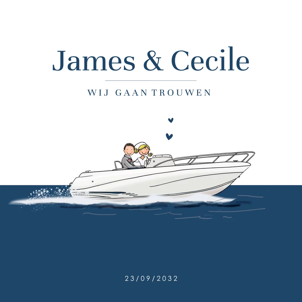 Trouwkaart speedboot met bruidspaar en hartjes op de achtergrond. Mocht je graag de haarkleuren anders zien, laat gerust weten, we passen deze voor je aan.
