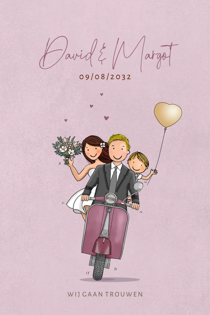 Trouwkaart trendy scooter met bruidspaar en kinderen met ballon en hartjes. Deze kaart is naar wens aanpasbaar. Je kunt nog extra kinderen op de vespa zetten. Mocht je hulp nodig hebben, mail ons.