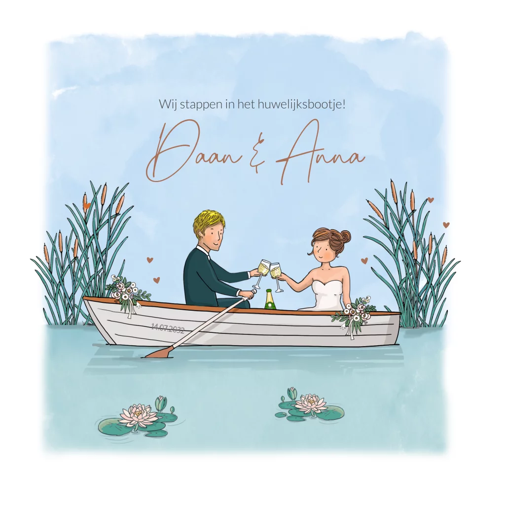 Trouwkaart vierkant bruidspaar bootje met waterlelie, teksten zijn naar wens aanpasbaar. Wil je een andere haarkleur, mail ons even, wij passen het voor je aan.