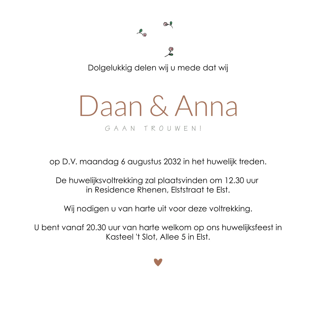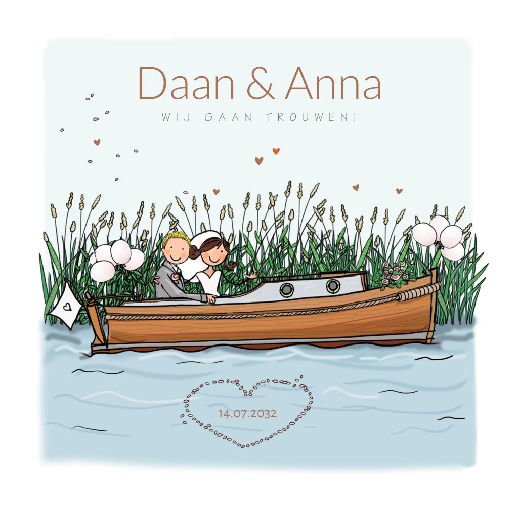 Trouwkaart vierkant kaartje, lief getekend bruidspaar in sloep met op de achtergrond gras. Mocht je de haarkleur anders willen, mail ons dan. Wij pasen het voor je aan.